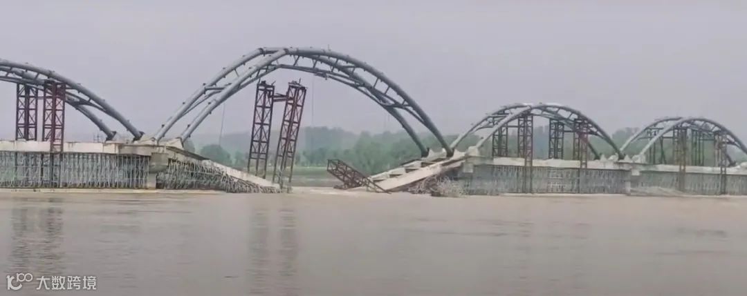 该工程为钢结构桥梁,因上部钢结构尚未完工,无法起到张拉作用,第四跨系梁仅依靠满堂架支撑,水量过大导致满堂架冲毁系梁坍塌。该险情未造成人员伤亡。
