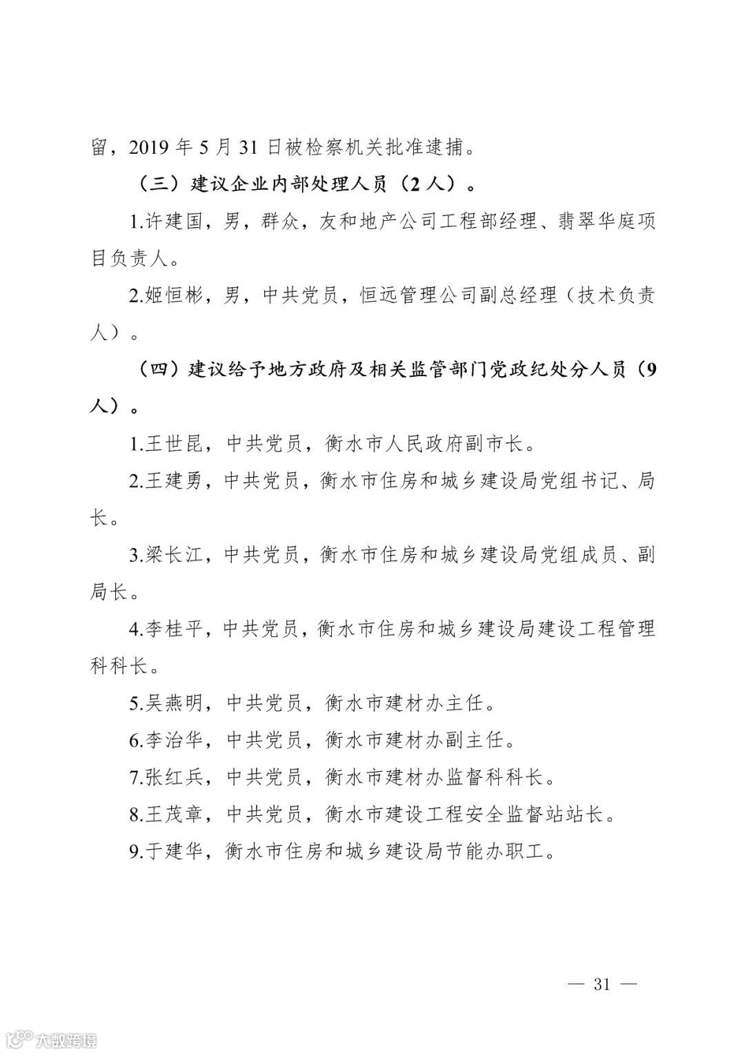 (13)于某华,男,中共党员,衡水市住房和城乡建设局节能办职工。违规在恒远管理公司兼职,担任翡翠华庭项目总监,涉嫌重大责任事故罪,已于2019年5月17日被公安机关刑事拘留,2019年5月31日被检察机关批准逮捕。