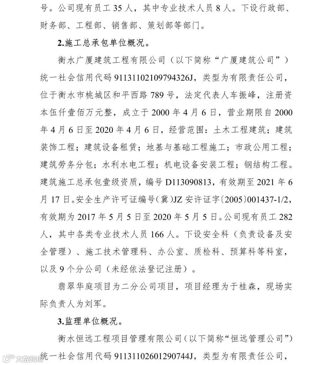 原判决认定,2019年4月25日上午7时20分左右,衡水市桃城区大庆路问津街东北角翡翠华庭项目在建1号楼建筑工地,发生施工升降机轿厢(吊笼)坠落的重大伤亡事故,造成11人死亡,2人受伤。