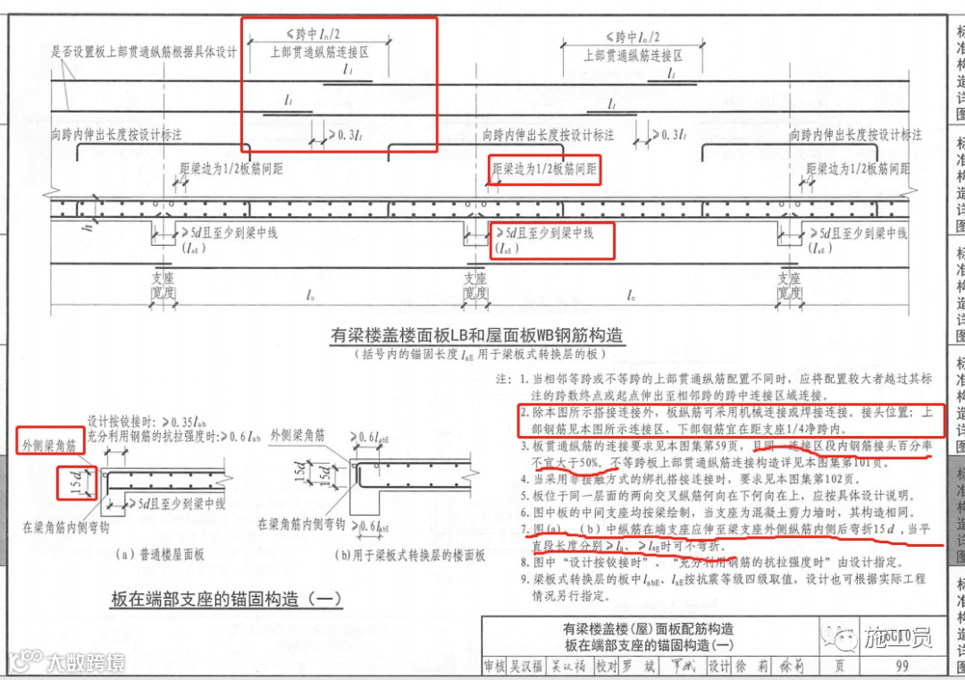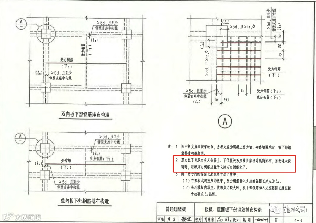 (1)、楼板上层钢筋搭接位置在跨中,下层钢筋在支座附近。