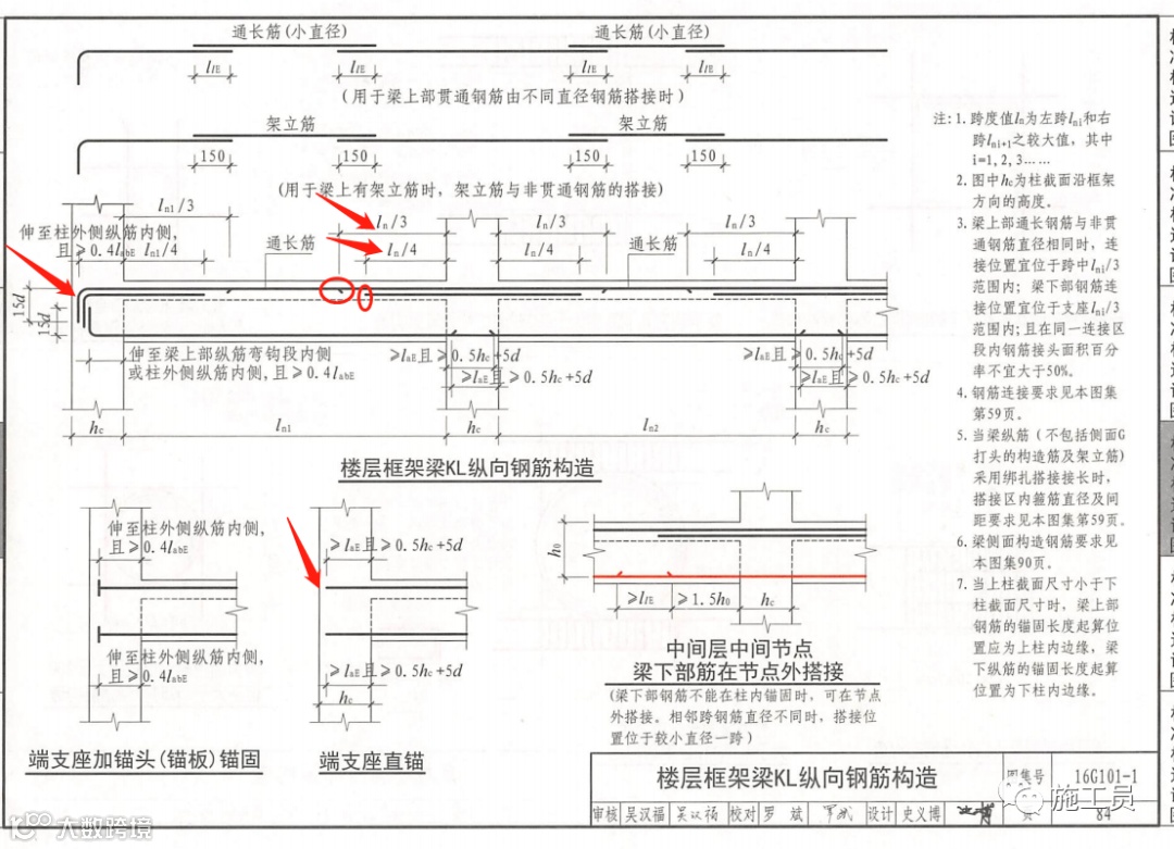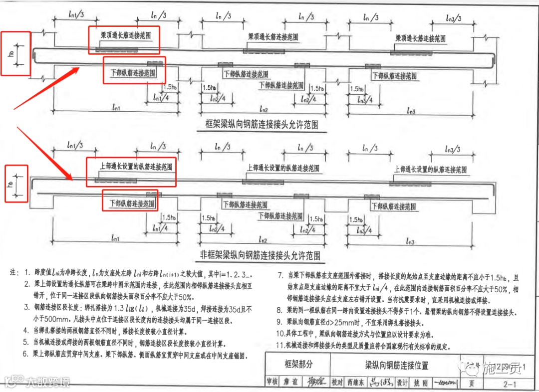 梁钢筋搭接位置:上部筋在跨中,下部筋在支座范围外搭接情况,搭接长度的起始点至支座边缘的距离不应小于1.5hb,且结束点距支座边缘的距离不宜大于Ln/4