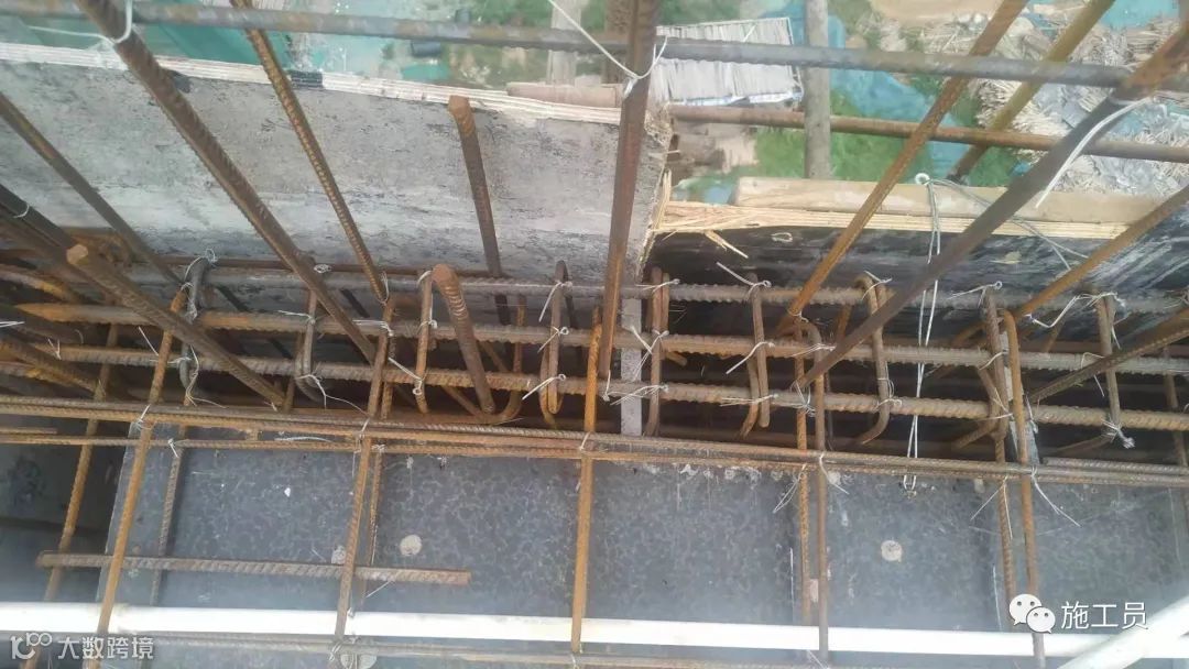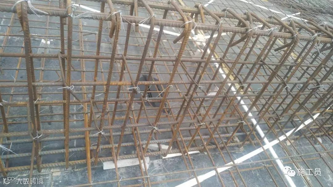 除悬挑梁箍筋开口方向向下,其余梁的开口朝向是向上的(本图是上翻梁),另外柱子箍筋是螺旋布置,梁中箍筋是相邻两个错开布置。