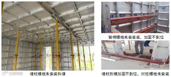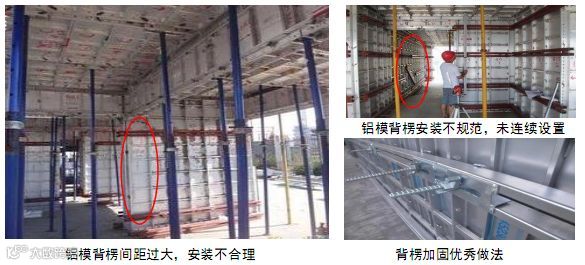 铝模背楞及螺杆缺失及设置不合理会造成铝模板墙板固定不牢,导致混凝土浇筑易爆模,影响混凝土结构外观质量,存在一定安全隐患。