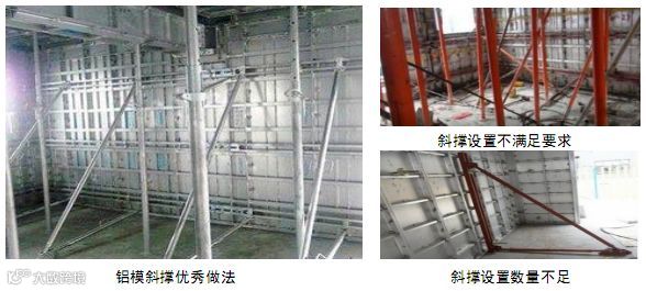 铝模斜撑设置不合要求直接影响模板的刚度和稳定性,易照成后期混凝土结构浇筑时模板失稳及偏位,导致混凝土成型质量感观差并且存在一定安全隐患。