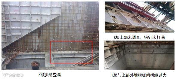 下部K板需与墙柱模板用销钉,销片连接固定牢固,上部K板需调直避免拼缝不严产生漏浆、错台,当外墙涨出截面变大>5mm时,将K板拆除(先装内墙),剔凿爆模部分,修补合格后再装回K板。当外墙内涨截面变小>5mm时,松动K板至标准截面再装外墙。