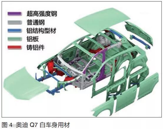 这一阶段以铝合金为主要车身材料,铝型材和铸铝件大量应用到车身结构件。高强钢、软钢和碳纤维为辅助用材,典型的车型代表是奥迪Q7车型(见图4)。