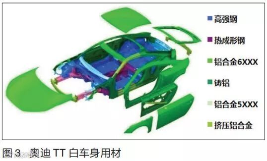 这个阶段,车身外覆盖件全部应用铝合金(铝板材)、铝型材和铸铝开始应用到车身结构件,轻量化效果显著,与此同时,高强钢和软钢板的用量急剧减少,典型的车型代表是奥迪TT车型(见图3)。