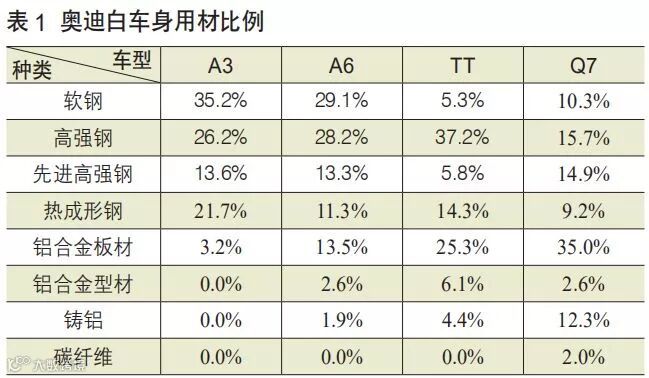 这个阶段主要是为了增加材料强度级别,热成形钢逐步用于车身,还有少量铝合金覆盖件的应用。典型的车型代表为奥迪A3车型(见图1)。