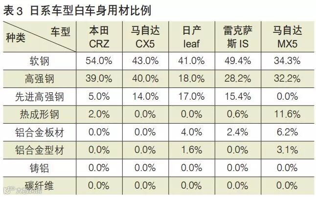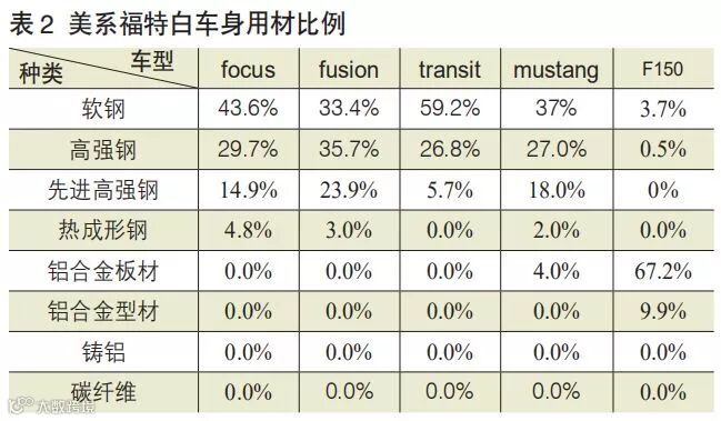 除欧系的奥迪车型外,美系福特和日系车的用材比例如表2、表3所示。