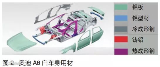 这一阶段,外覆盖件大量采用铝合金,铝合金覆盖件比重显著增加,热成形钢比重相对减少,典型的车型代表是奥迪A6车型(见图2)。