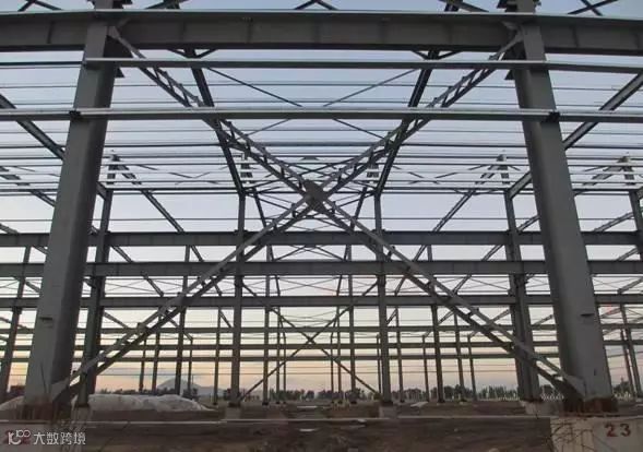 对于没有吊车系统的一般轻钢厂房,可以只设置一层柱间支撑,如果厂房过高,导致柱间支撑角度过小,则须分层设置。