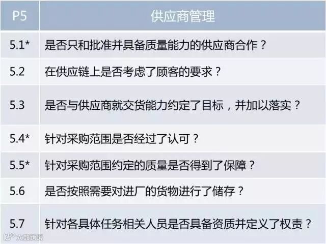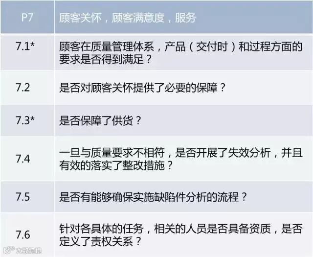 如果你已经是批量供应商,那Formel Q质量能力只看三个地方:供应商管理、生产过程、客户管理。其分别的提问如下(以下条款摘自VDA6.3第二版本):