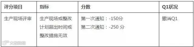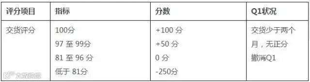每一个供应商的Q1初始分为1000分;为了保持Q1,供应商必须维持至少800分。根据工厂以上业绩表现加减分数。