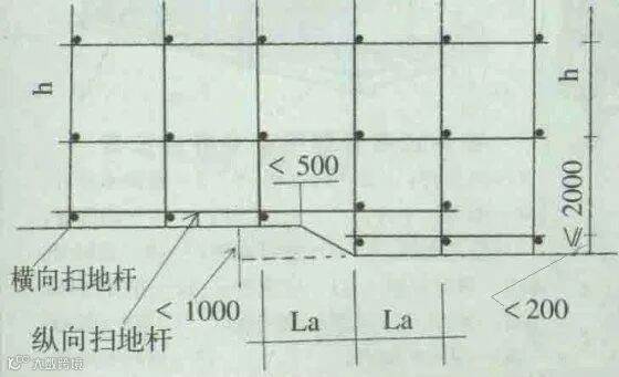 纵横向扫地杆:纵向扫地杆采用直角扣件固定在距底座下皮20cm处的立柱上,横向扫地杆则用直角扣件固定在紧靠纵向扫地杆下方的立柱上,通道出入口位置,有存在绊倒的危险时可不用安装扫地杆。