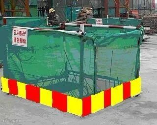 基坑护栏设置要求:采用可拆卸水管护栏,高度1.2m,再挂安全网防护,底部安装180mm高踢脚板,踢脚板采用≥9mm厚胶合板制作,推荐使用混凝土反坎踢脚板。