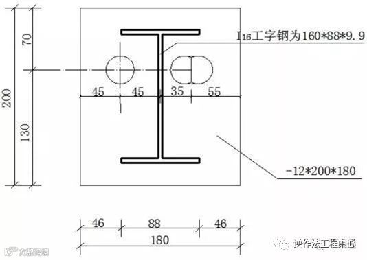 根据选定的16号工字钢的长度和铁板的大小及厚度绘制加工平面图,见下图,对工人进行交底,现场用氧气切割下料,同时也可委托加工厂进行成品加工。