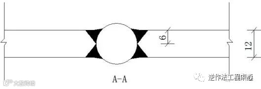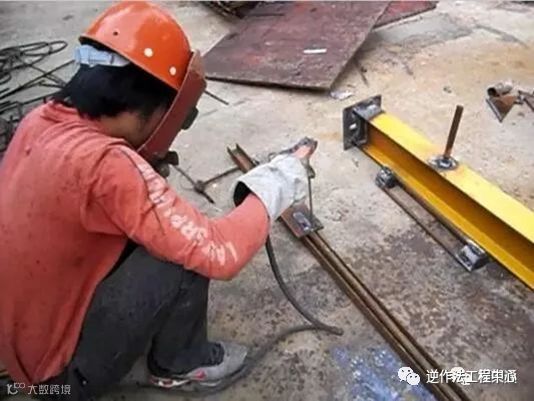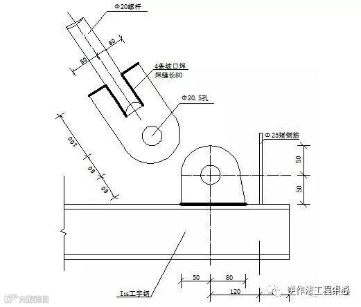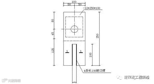 3、下端Φ20*1.0米碳素优质钢与250mm*10mm*12mm铁板(根据楼层面而定),打孔切割槽距(槽距为20*100)后进行坡口焊接,见下图。