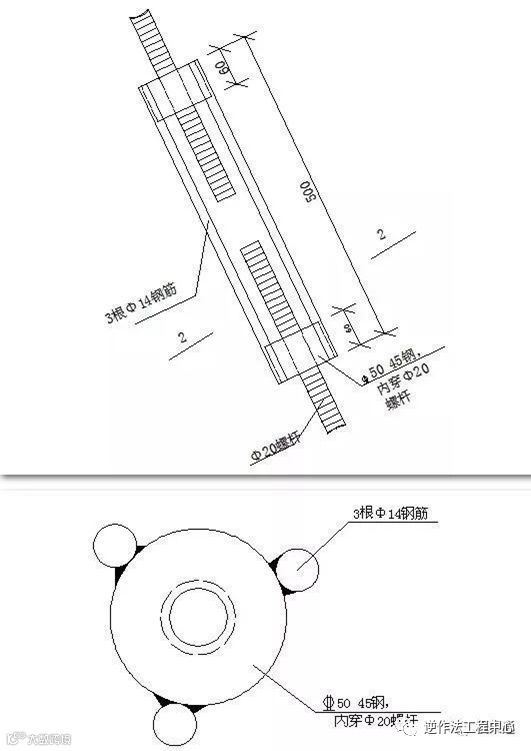 2、上端:在工字钢悬挑的上楼层对应处预埋25*200㎜套管一根,套管两端采用胶带封闭,焊接在梁、墙柱上;