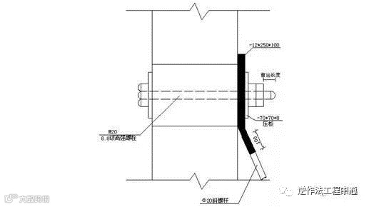 2、上端Φ20*1.6米碳素优质钢与250*10*12㎜铁板弯曲成20°(根据楼层面而定),打孔切割槽距(槽距为20*100)后进行坡口焊接,见下图。