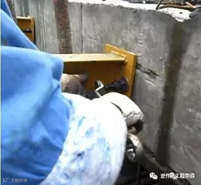 1、待悬挑上一层混凝土达到强度后,拆除梁侧模,将高强螺栓加垫片从套管中由内往外穿出,并将上拉杆的耳板与高强螺栓用双螺母加垫片固定牢固。