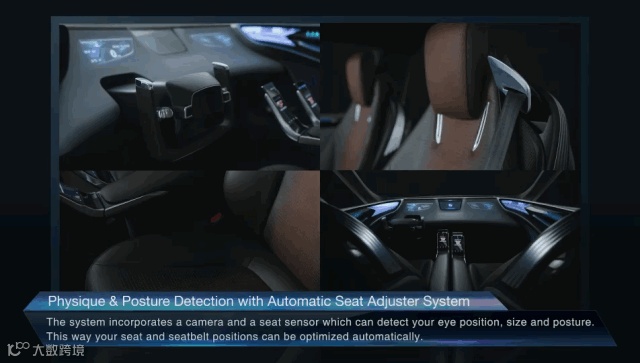 该设计包括赛车式方向盘,全息仪表板和相机(不是侧后视镜)。这项设计的重点之一便是智能座椅:相机和座椅传感器来检测人的眼睛位置,大小和姿势,并对座椅和安全带进行自动调节,使乘员更加舒适。此外,该技术还包括个人空调系统,它可监控每个人的体温,自动调节空调温度。