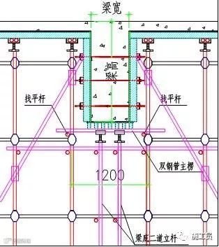 在底板或楼层板结构板面上上弹出梁的边线,便于确定梁两侧立杆位置及梁下立杆布置。