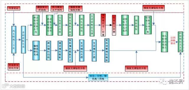 1、安装工艺流程:弹梁轴线并复核→搭支模架→调整托梁→摆主梁→安放梁底模并固定→梁底起拱 →扎梁筋→安侧模→侧模拉线支撑(梁高加对拉螺栓)→复核梁模尺寸、标高、位置→ 与相邻模板连固。