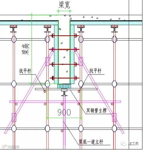 梁宽≤500,采用该种模板支设方式(梁两侧立杆间距900mm)