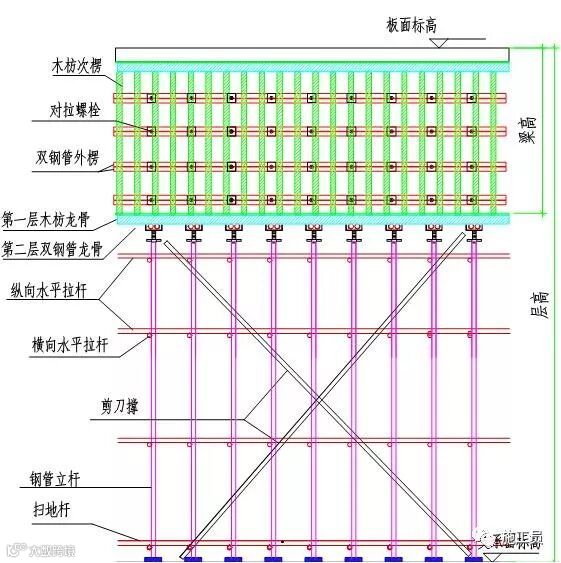 b、板下立杆为轮扣式钢管架。立杆上设置U型顶托,U型顶托上双钢管主楞。立杆底部垫20cm×20cm的方形模板块,垫板厚度不宜小于50mm,立杆不得直接落在混凝土面。模板支撑体系必须设置纵横扫地杆,扫地杆离地高度不大于200mm。