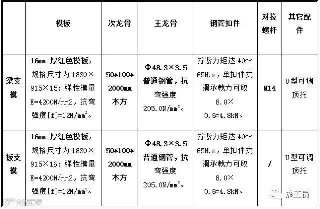 模板选用:16mm 厚红色模板,弹性模量E=4200N/mm2,抗弯强度[f]=12N/mm2。