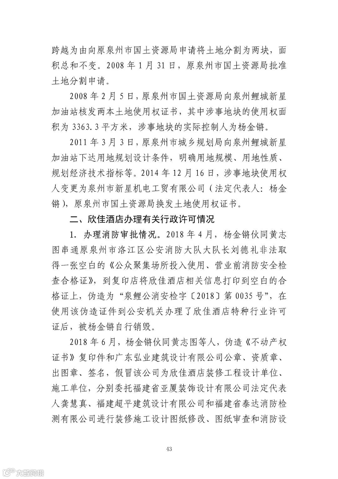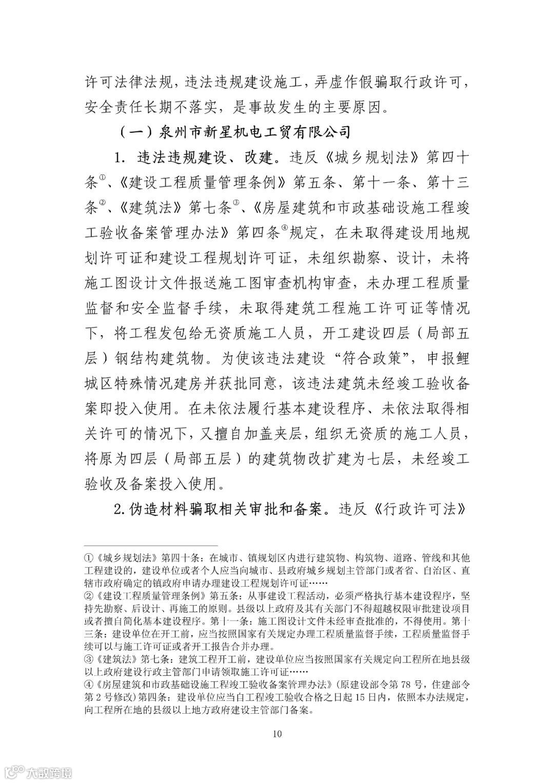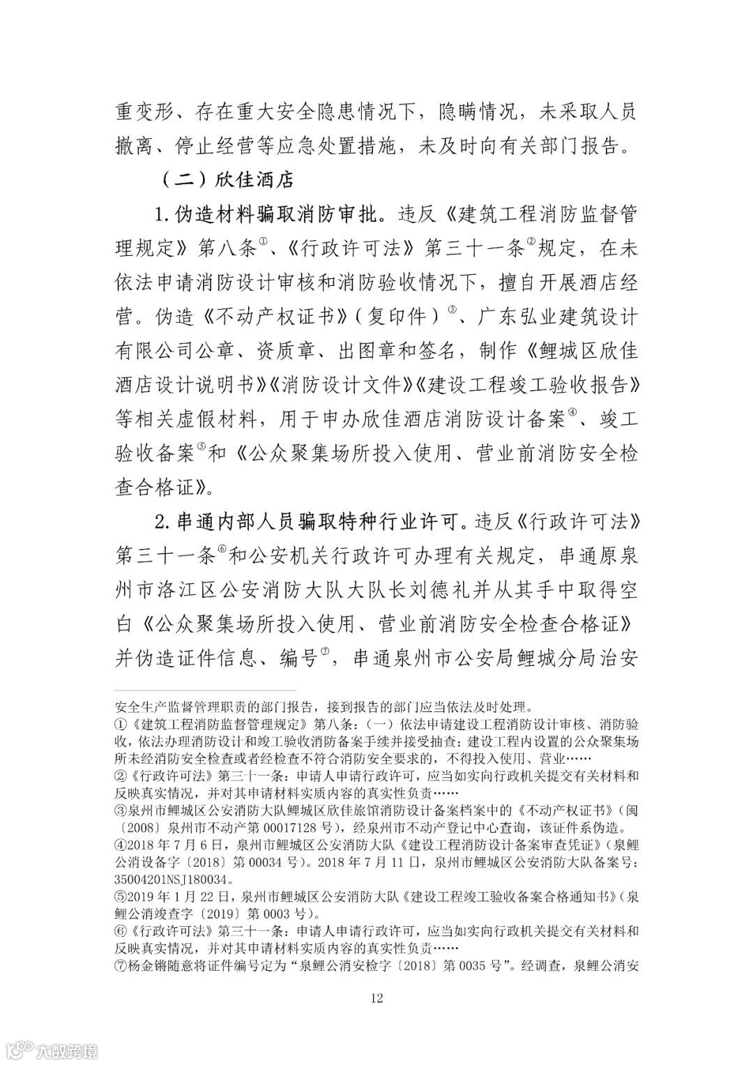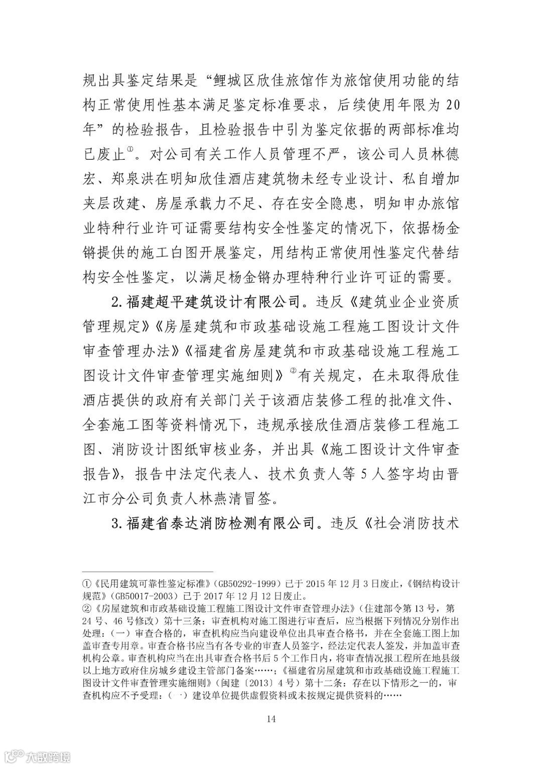 泉州市新星机电工贸有限公司、欣佳酒店及其实际控制人杨金锵无视国家有关城乡规划、建设、安全生产以及行政许可等法律法规,违法违规建设施工,弄虚作假骗取行政许可,安全生产责任长期不落实。相关工程质量检测、建筑设计、消防检测、装饰设计等中介服务机构违规承接业务,出具虚假报告,制作虚假材料帮助事故企业通过行政审批。