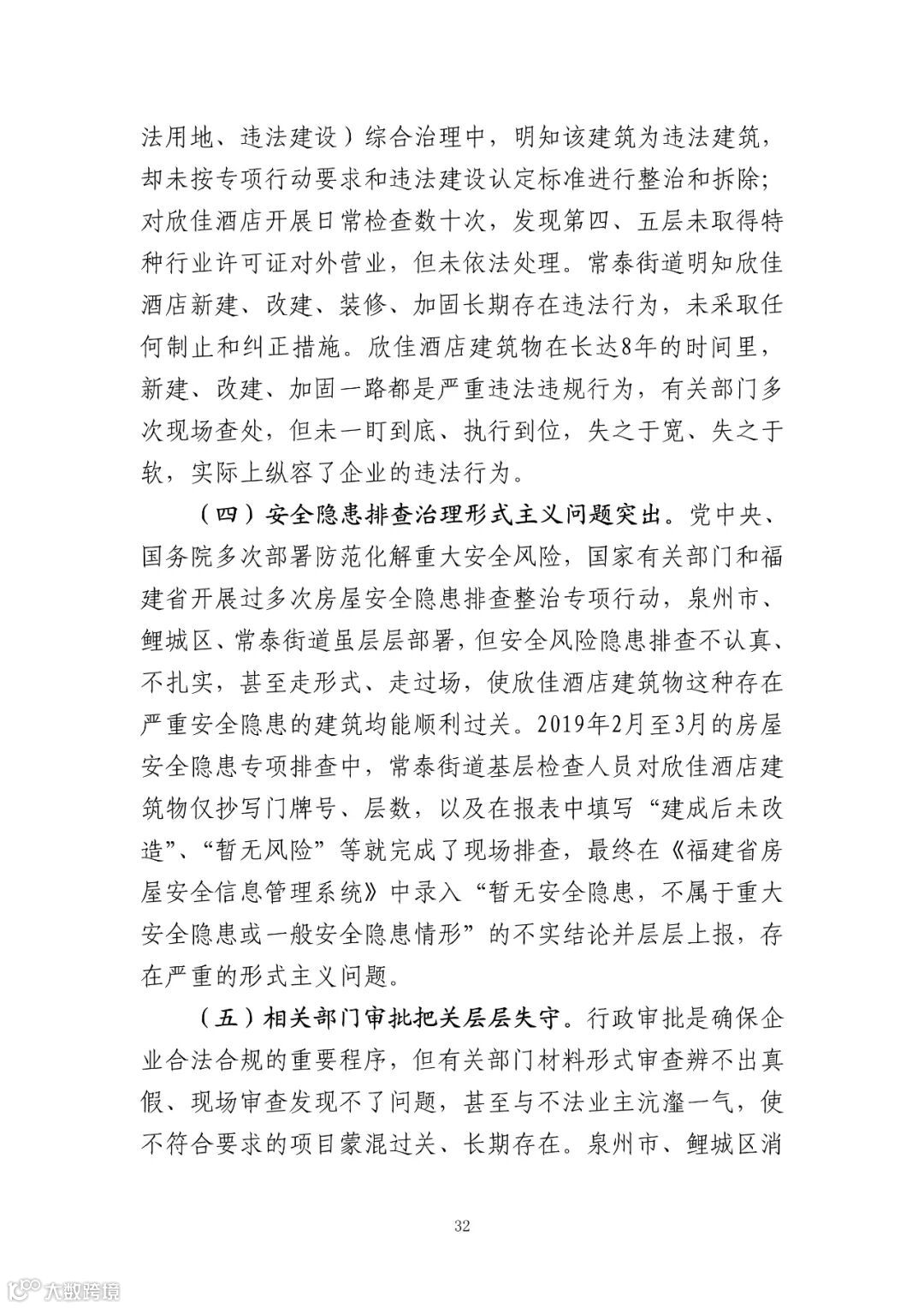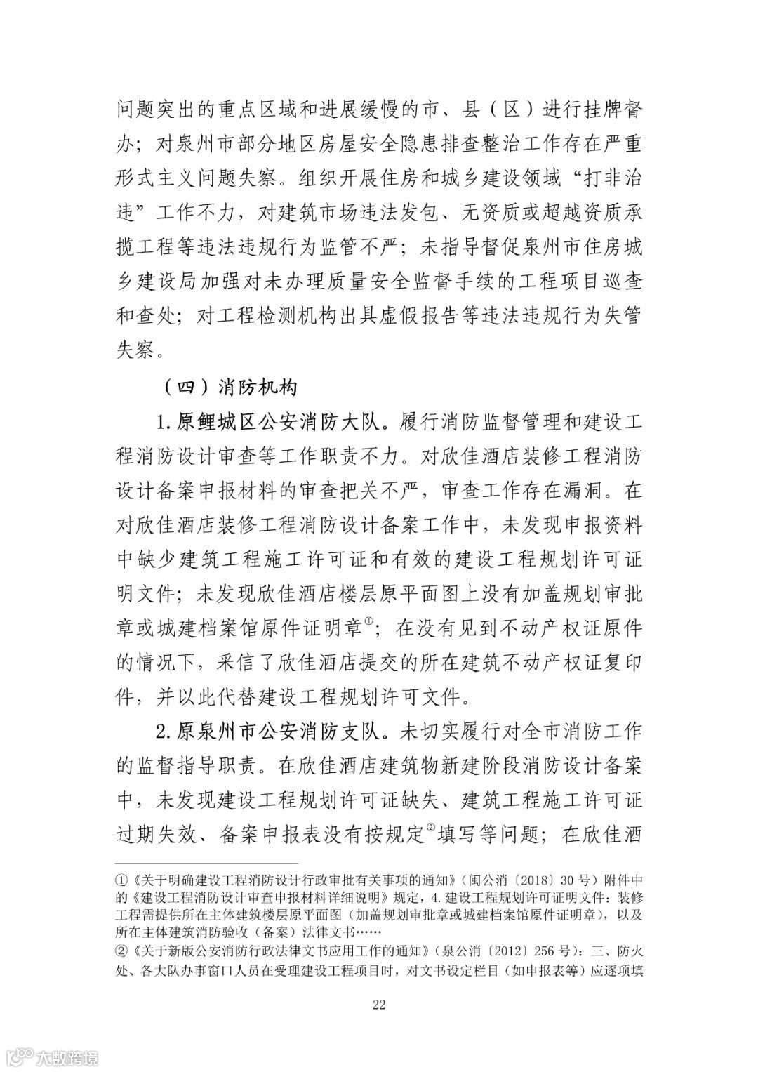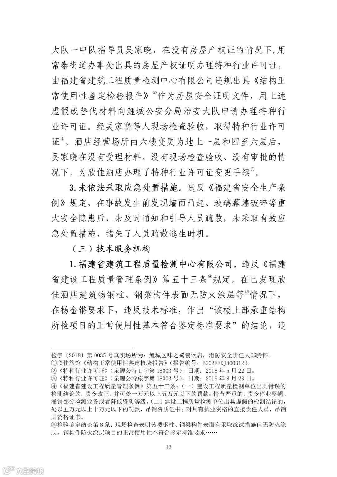 泉州市新星机电工贸有限公司、欣佳酒店及其实际控制人杨金锵无视国家有关城乡规划、建设、安全生产以及行政许可等法律法规,违法违规建设施工,弄虚作假骗取行政许可,安全生产责任长期不落实。相关工程质量检测、建筑设计、消防检测、装饰设计等中介服务机构违规承接业务,出具虚假报告,制作虚假材料帮助事故企业通过行政审批。