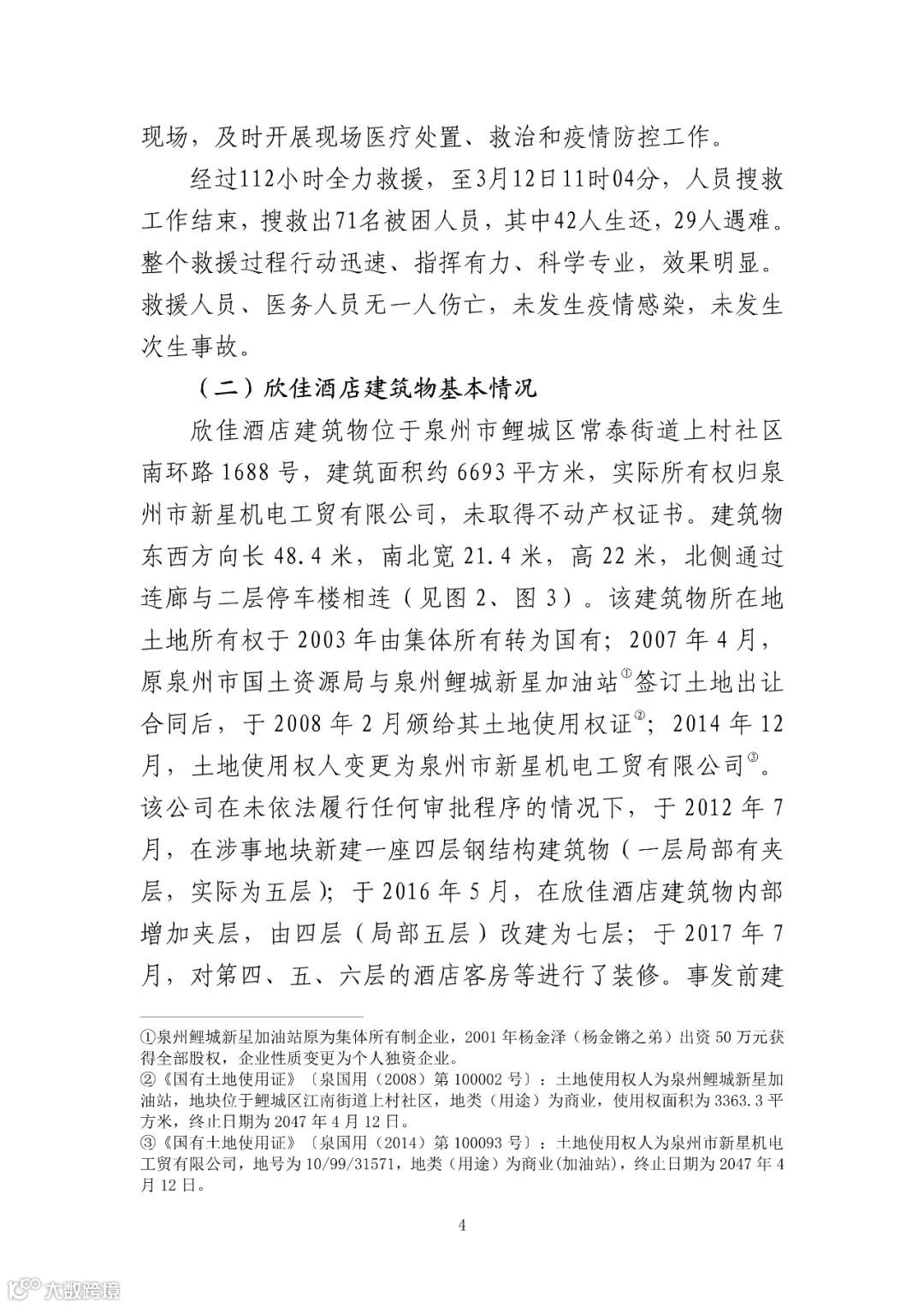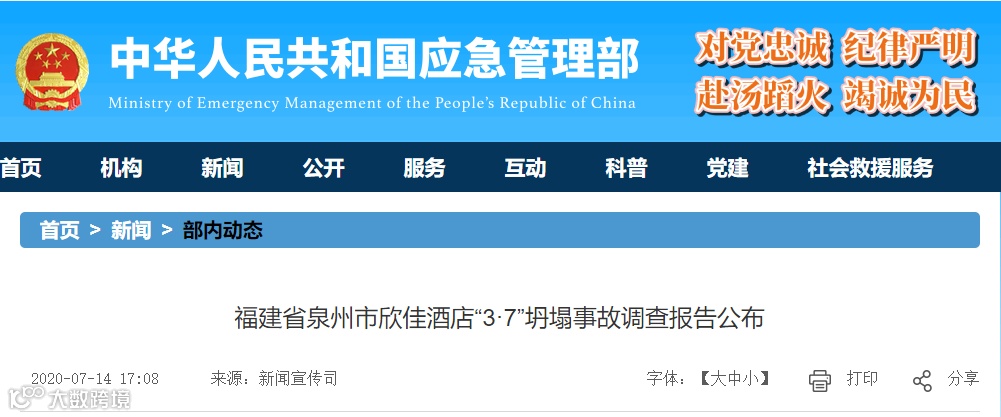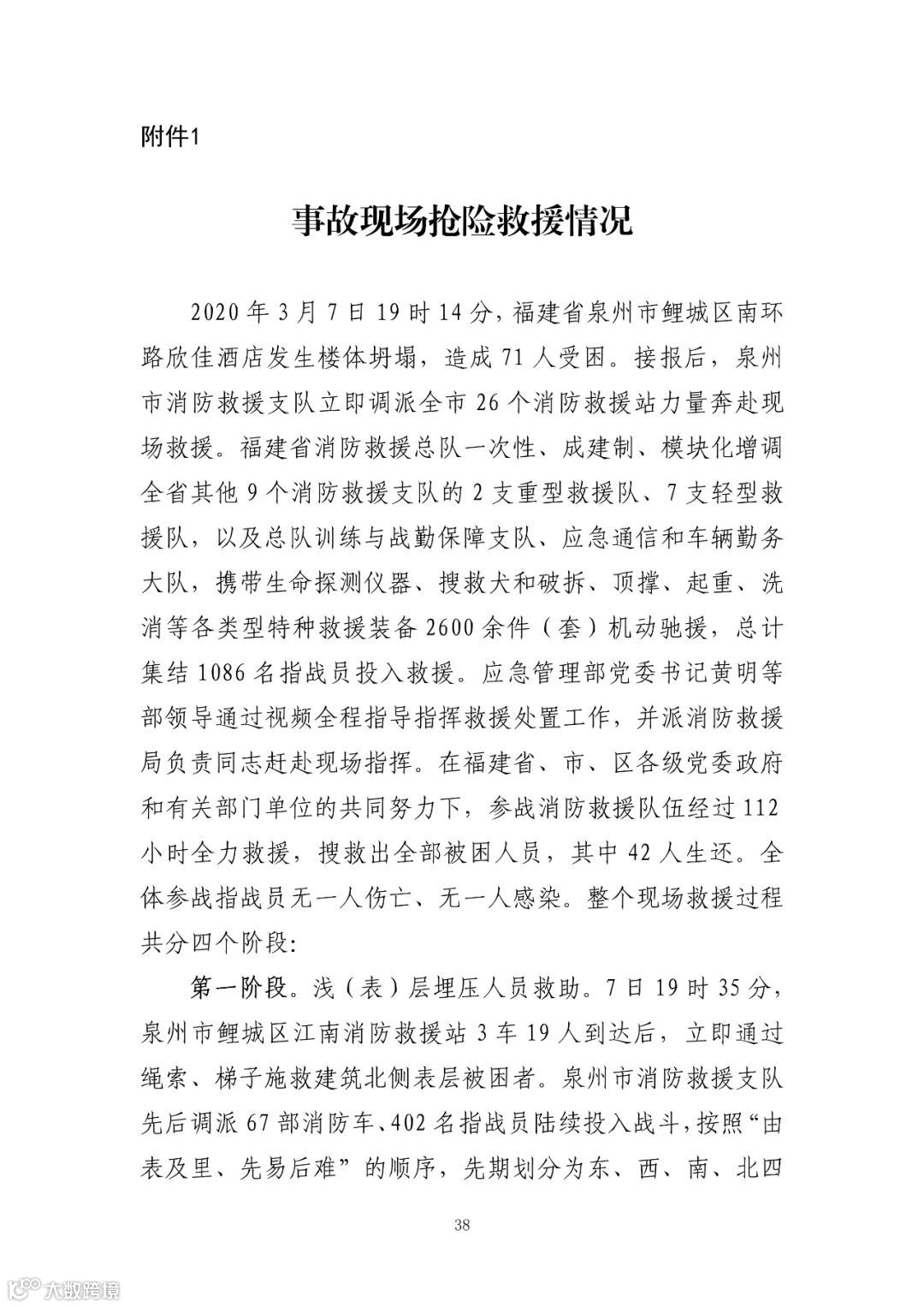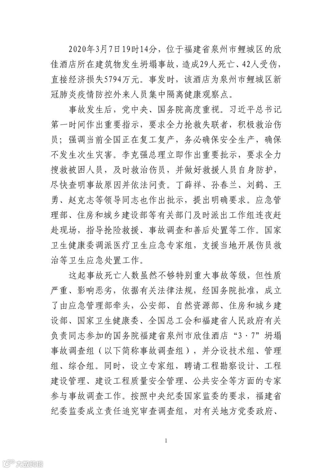 2020年3月7日19时14分,位于福建省泉州市鲤城区的欣佳酒店所在建筑物发生坍塌事故,造成29人死亡、42人受伤,直接经济损失5794万元。
