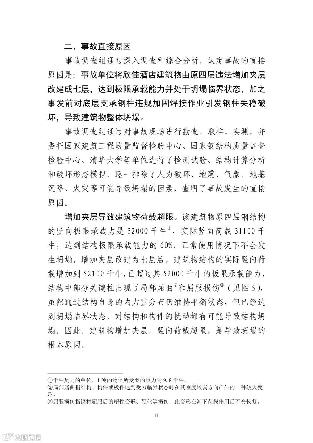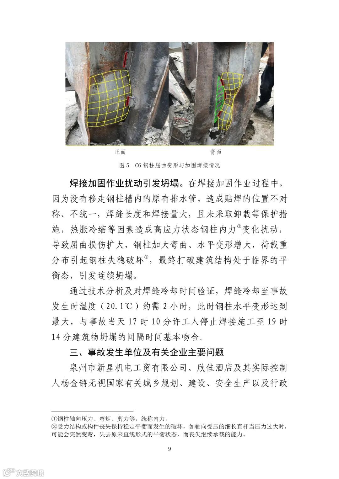 事故责任单位泉州市新星机电工贸有限公司将欣佳酒店建筑物由原四层违法增加夹层改建成七层,达到极限承载能力并处于坍塌临界状态,加之事发前对底层支承钢柱违规加固焊接作业引发钢柱失稳破坏,导致建筑物整体坍塌。