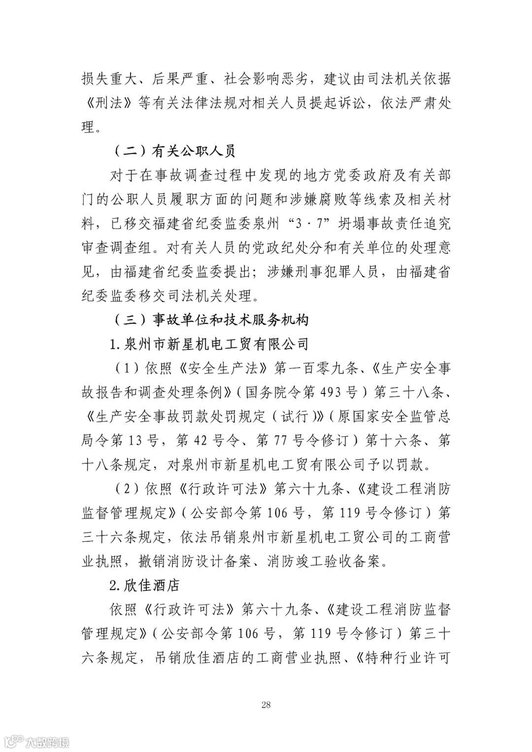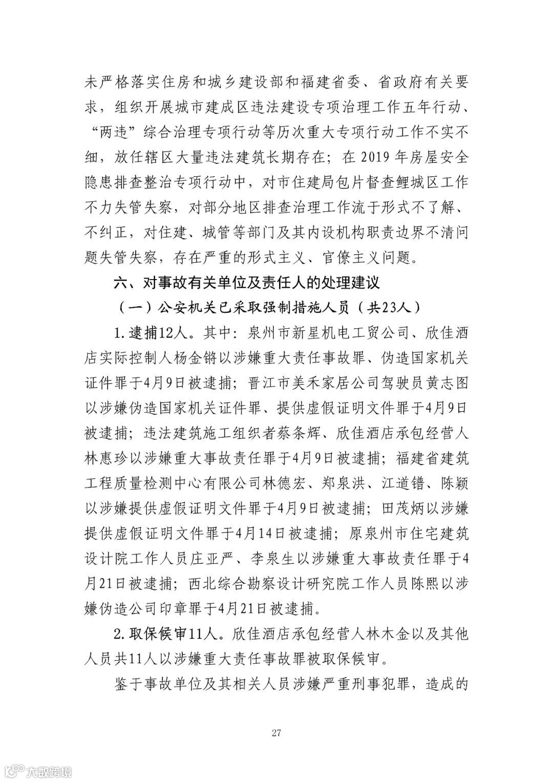 泉州市新星机电工贸有限公司法定代表人杨金锵、泉州市广鑫建设工程公司法定代表人蔡条辉等23名相关责任人员被公安机关依法立案侦查并采取刑事强制措施。