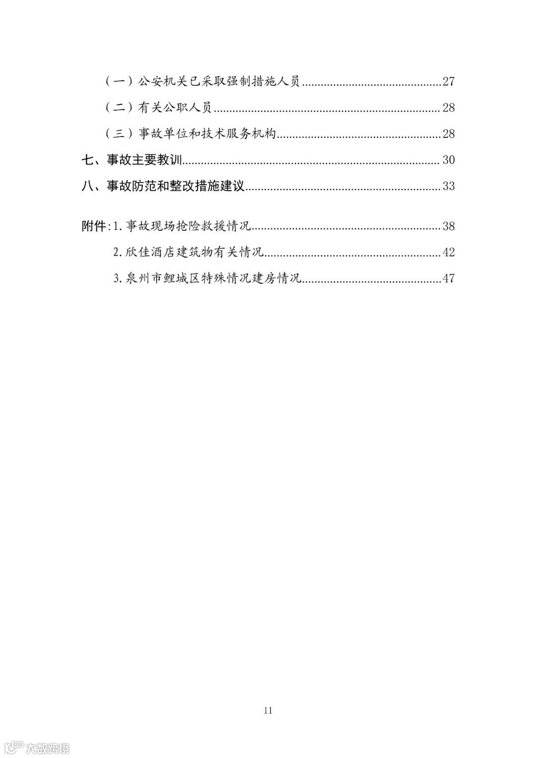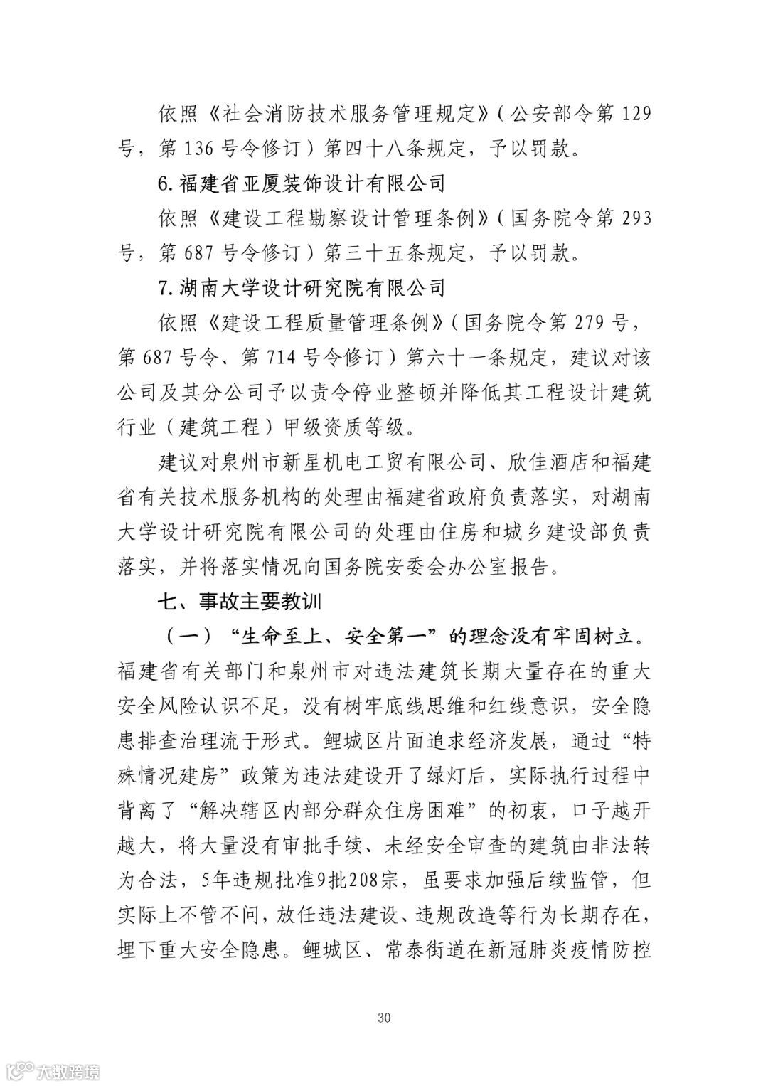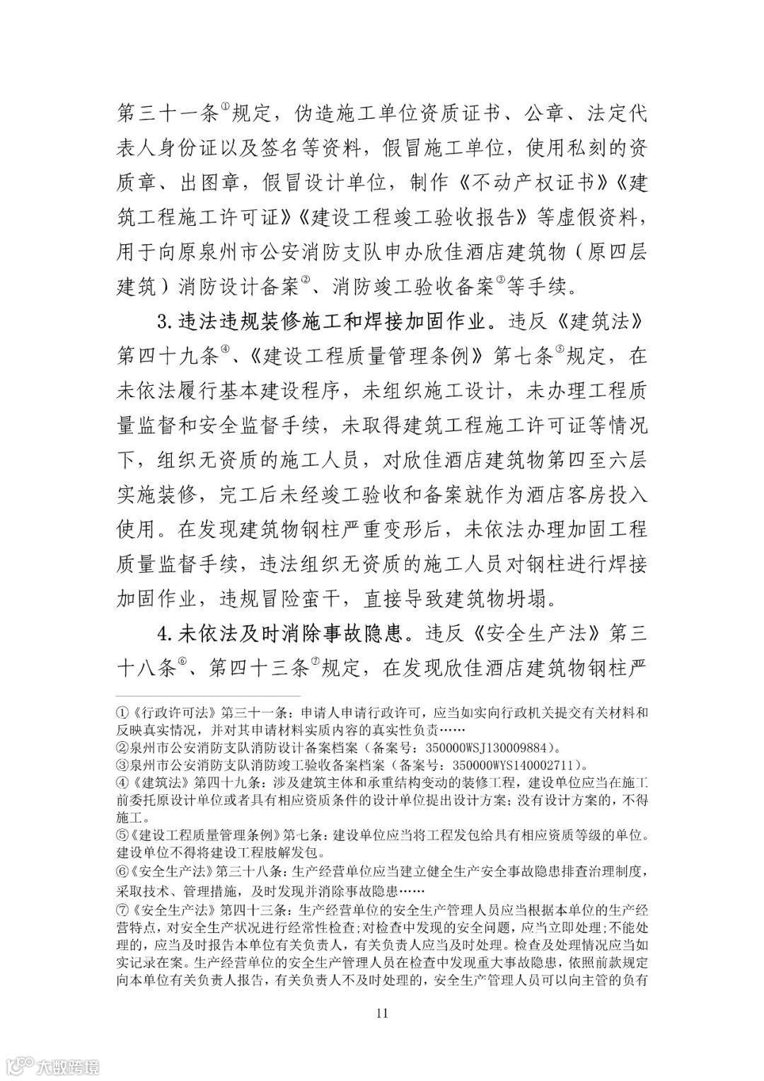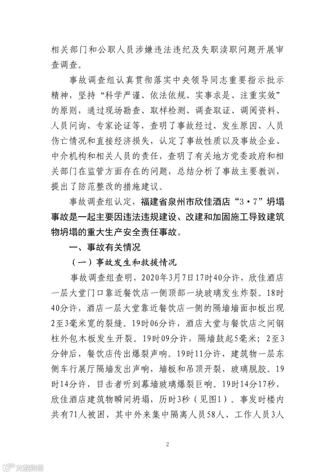 国务院批复福建省泉州市欣佳酒店“3·7”坍塌事故调查报告,认定福建省泉州市欣佳酒店“3·7”坍塌事故是一起主要因违法违规建设、改建和加固施工导致建筑物坍塌的重大生产安全责任事故。