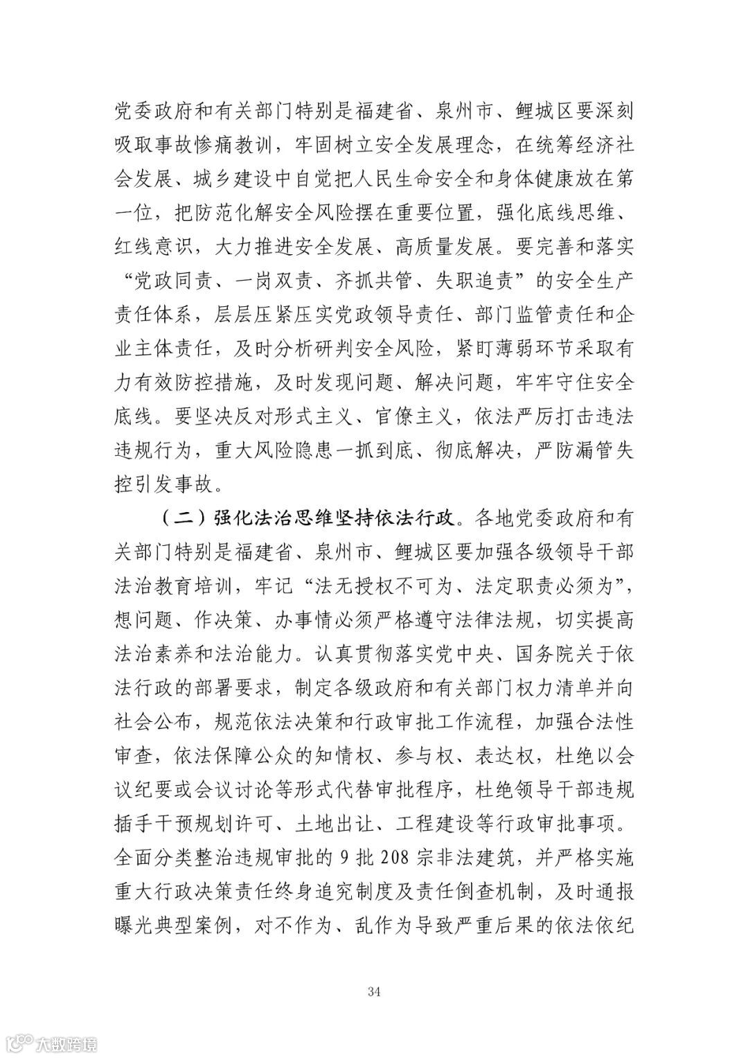 福建省纪检监察机关对该起事故中存在失职失责问题的41名公职人员给予党纪政务处分,1人予以诫勉。其中:省管干部9人、泉州市管及以下干部33人;主要领导责任14人、重要领导责任5人、监督责任2人、直接责任21人;厅级干部7人、处级干部13人、其他22人。