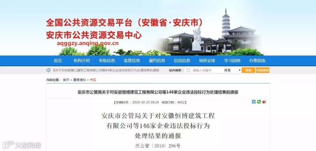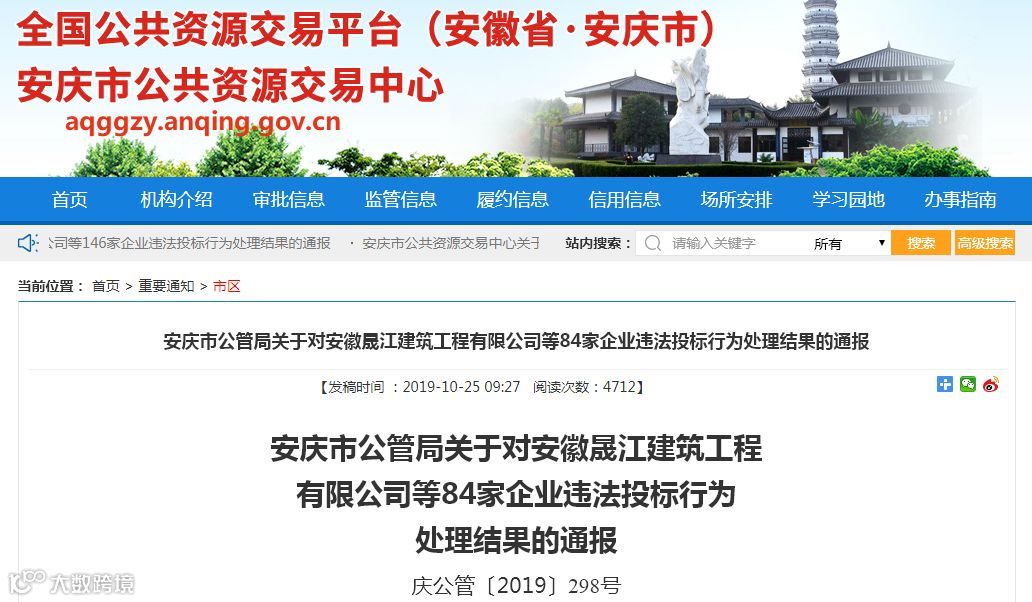 同一天(10月25日),安徽省安庆市公共资源交易中心发布另一则通报,共有466家企业现场参与投标,投标企业数量异常。84家投标企业的投标文件商务标中道路、景观、排水部分组价形式等内容存在不同单位同一子目的消耗量及组价异常相同,组价及补充定额编号异常相同,组价及调整系数异常相同,消耗量及补充定额编号异常相同,组价异常相同等情形。认定为“串通投标”。