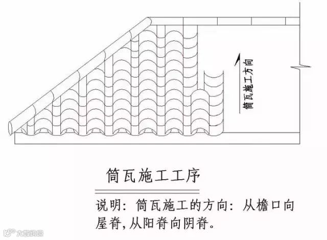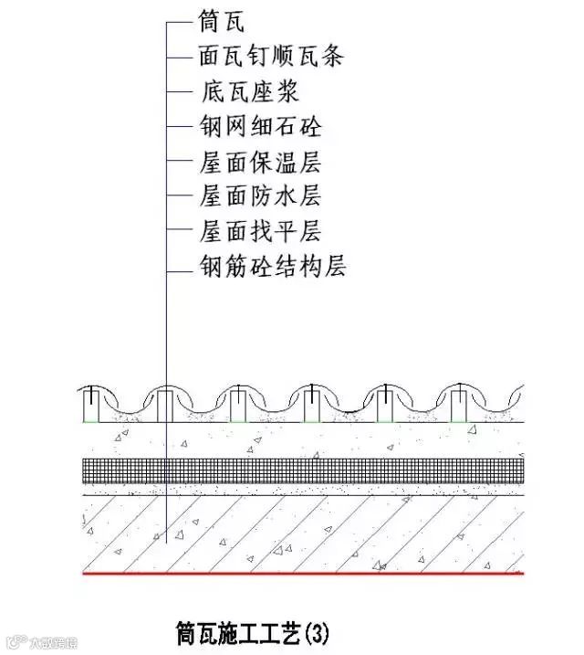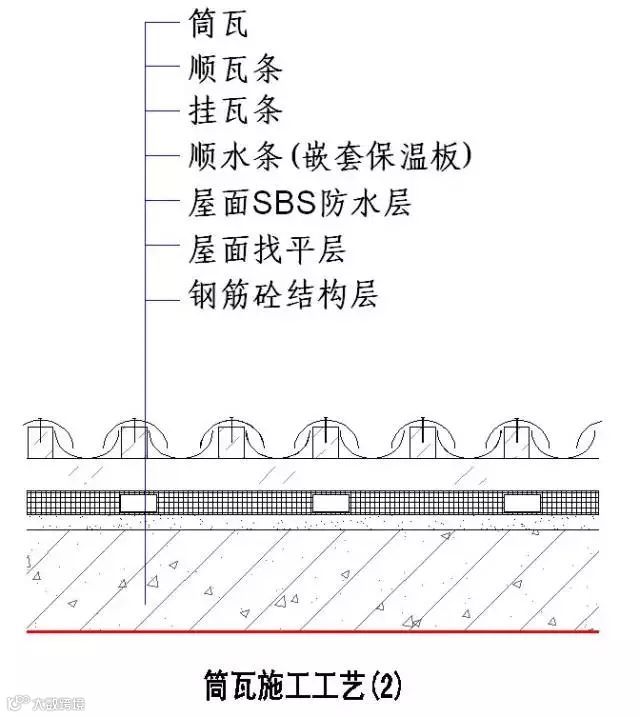 1)施工工序依次为:混凝土结构层-找平层-防水层-顺水条(嵌套保温板)-挂瓦条-顺瓦条-筒瓦。