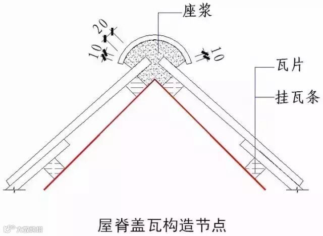 7)挂瓦条规格30×30mm杉木条,顺瓦条宽度30,厚度根据瓦弄净空而定,杉木条用水沥青涂刷防腐处理。