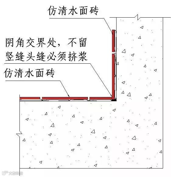 1)两个面的面砖在阳角交接时,交界角切割角度大于50度,拼接时必须用砂浆挤压,使交界处不留空隙;