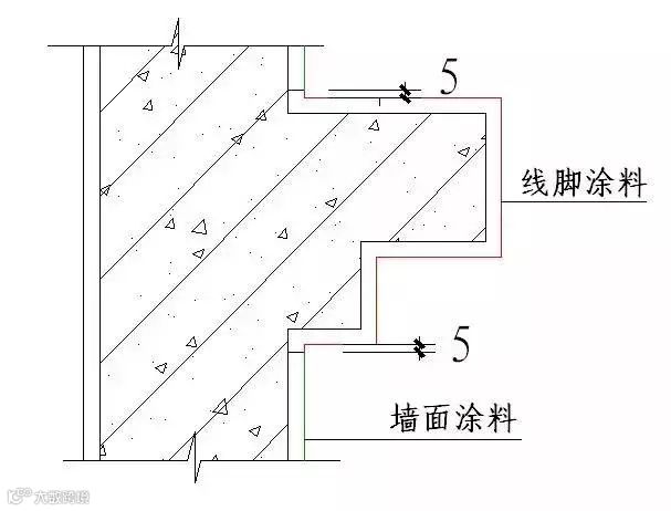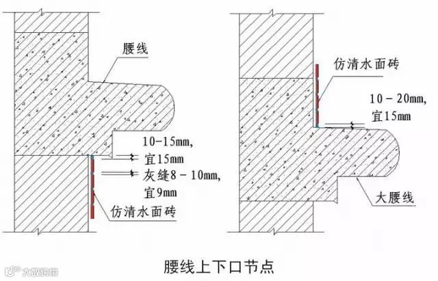 面砖在粘贴时,在面砖与上腰线之间留出10-15mm(宜15mm),线条上涂料跟下5mm,面砖与下腰线之间留出10-20mm(宜15mm)。