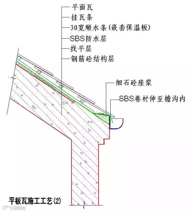 1)施工工序依次为:混凝土结构层-找平层-防水层-顺水条(嵌套保温板)-挂瓦条-水泥平板瓦。