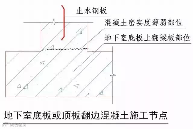 由于商品混凝土坍落度大,在进行地下室底板或顶板翻边部位施工时,振动棒振捣使混凝土流座到底板,施工人员往往少振或不振捣,导致混凝土不密实,因此形成渗漏薄弱点。