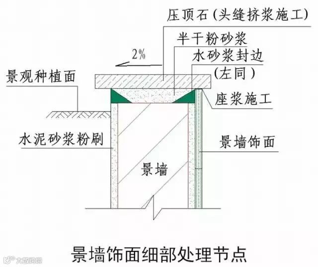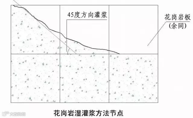 5)灌水泥砂浆时要求成45度方向灌实,所有腰线顶面板及压顶板严禁半干粉砂浆铺板,必须使用流动的水泥砂浆铺贴面板。