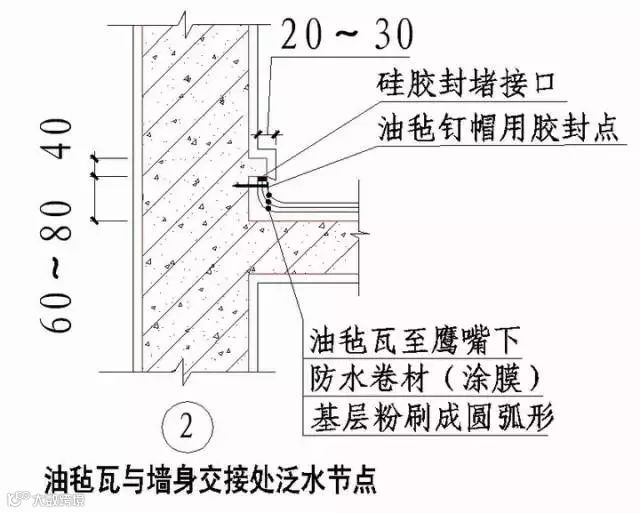 5)油毡瓦屋面与突出屋面部分交接处均应做泛水处理,可沿屋面坡度做通长挡水线,并在挡水线下做老鹰嘴(见图2),油毡瓦屋面与突出屋面管道交接处做法(见图3)。
