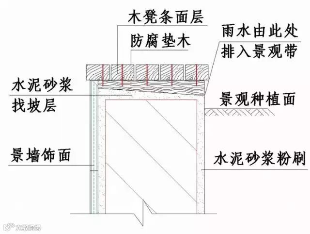 注:线脚压顶板与墙体之间预留10-15mm,施工时,压顶板从外向墙根方向挤压施工,使水砂浆从该预留缝中挤出,未饱满处用原浆灌实,压顶板定位后,将挤出砂浆清理。