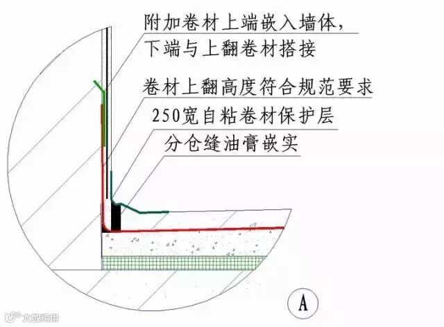 5)卷材施工与基层粘结牢固、无起鼓。卷材搭接和翻边高度符合规范要求,翻边处上口卷材插入混凝土保护层或粉刷层内。