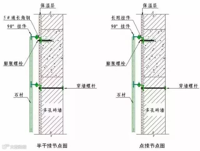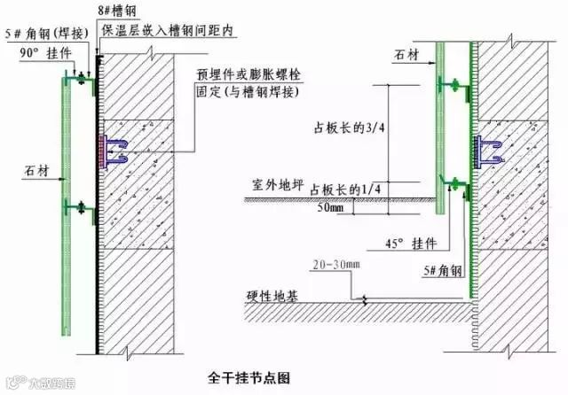 1)石材挂板用双股18#铜丝或钢丝钩与墙面固定,墙面用手提切割机从上而下或45度方向切槽缝,用钢钉插入缝内,单块石材板纵向长度大于300mm时不得少于两处挂点。