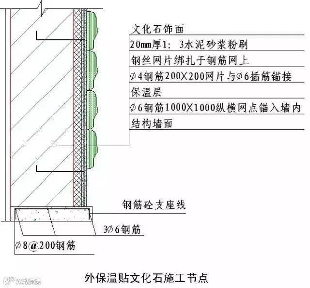 3)文化石饰面高度超过一层时,在二层圈梁部位增设一道钢筋混凝土支座线,如有饰面要求,可选用暗设方案施工。